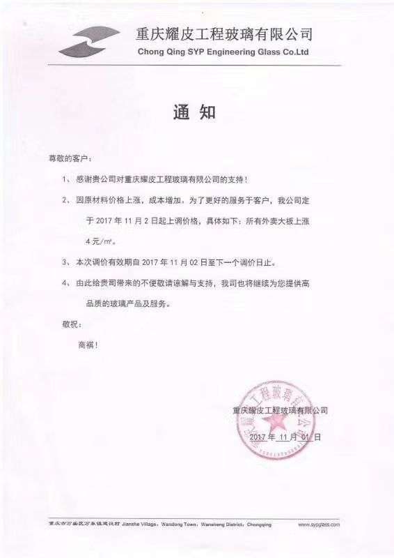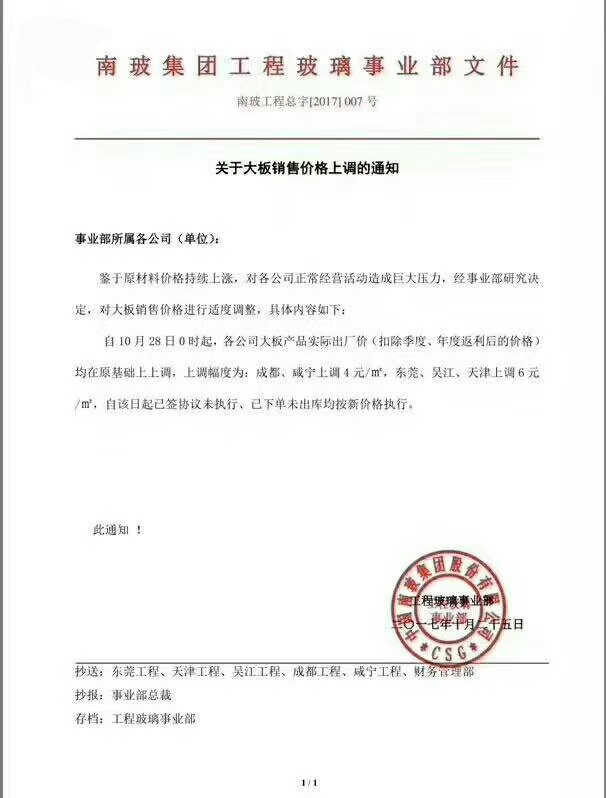“金(jin)九銀十”已經過(guo)去(qu),隨(sui)著各地環保政策的實(shi)施,9月(yue)份你在想也許10月(yue)份玻璃價(jia)格(ge)會降;10月(yue)份(fen)你看到各大廠家的漲(zhang)價通知,你(ni)猶(you)豫了,你(ni)說等(deng)等(deng)也許11月(yue)份(fen)價(jia)格會跌,如今(jin)11月(yue)份(fen)了,各大廠家的漲(zhang)價(jia)通知已經下來(lai)了