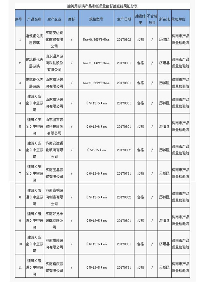據濟(ji)南市質量技術監(jian)督局10月18日消息,2017年(nian)7月-9月,該局組(zu)織(zhi)開(kai)展了建筑用玻璃產(chan)(chan)品質量市監(jian)督抽查(cha)。本次共(gong)抽查(cha)了全市8家企(qi)業生產(chan)(chan)的 11批次產(chan)(chan)品,未(wei)發(fa)現不合格(ge)產(chan)(chan)品。